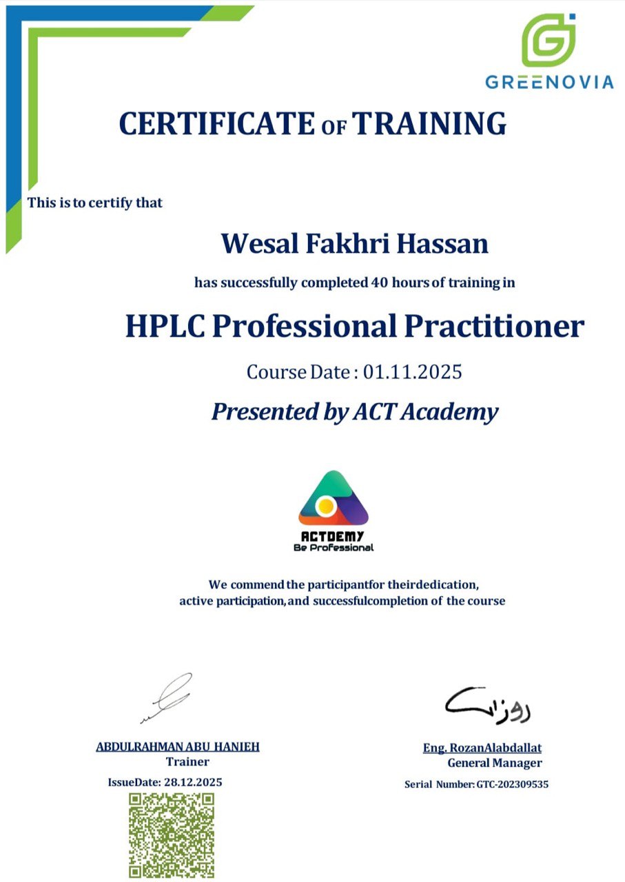 Professor Dr. Wissal Fakhri Hassan, a faculty member at the College of Marine Sciences, attended a specialized training course on High-Performance Liquid Chromatography (HPLC) instruments organized by the ACT Academy Jordan.