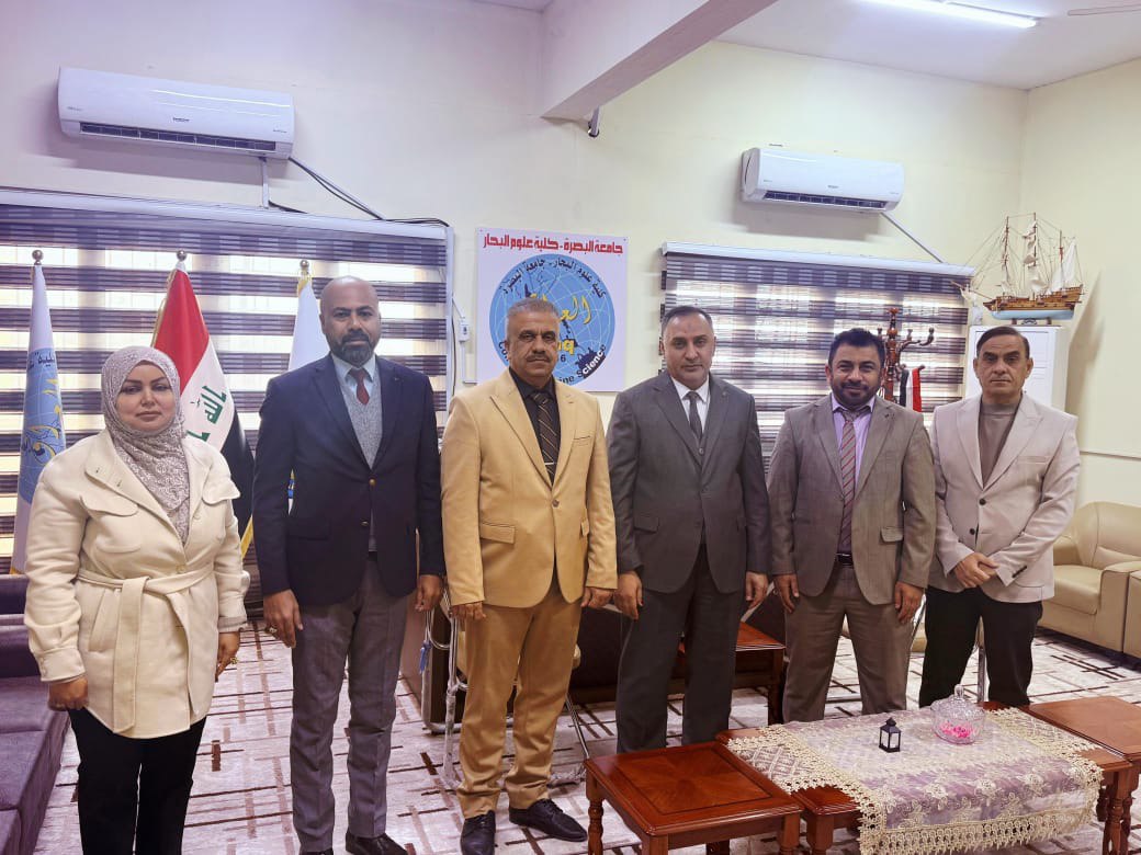 The Central Committee from the Quality Assurance and University Performance Department visited the College of Marine Sciences to monitor quality and evaluate performance. They were received by Assistant Professor Dr. Osama Qasim Khalifa, Dean of the College; Professor Dr. Nawras Abdul Ghani Abdul Zahra, Scientific Assistant; Dr. Imad Jassim Al-Shawi, Head of the Quality Division; and liaison officers from the Quality Division, Dr. Najid Faisal Sharif and Assistant Lecturer Safa Hussein Saki.