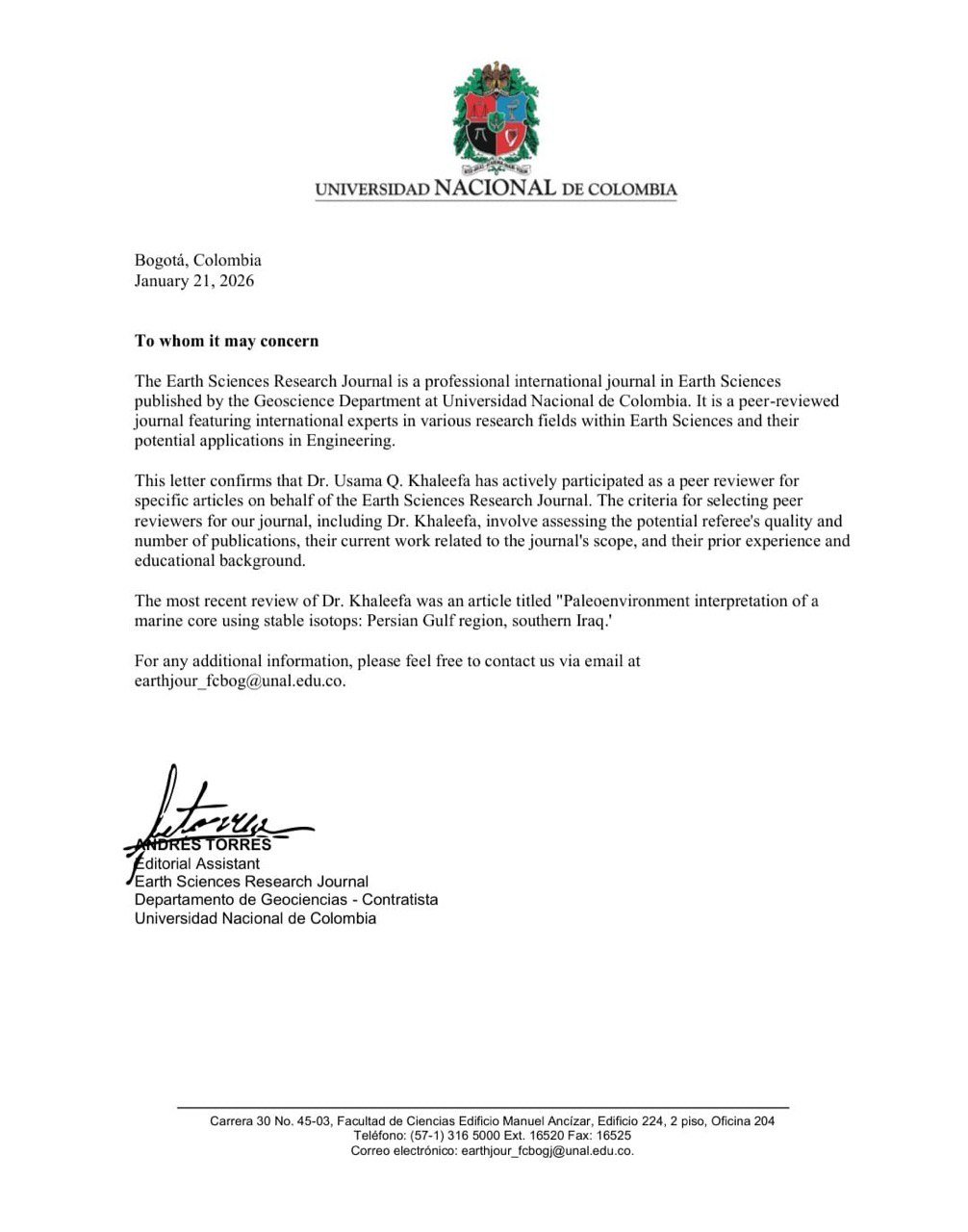 Assistant Professor Dr. Osama Qasim Khalifa, Dean of the College of Marine Sciences, has been selected as a scientific reviewer for the Earth Sciences Research Journal, published by the National University of Colombia.