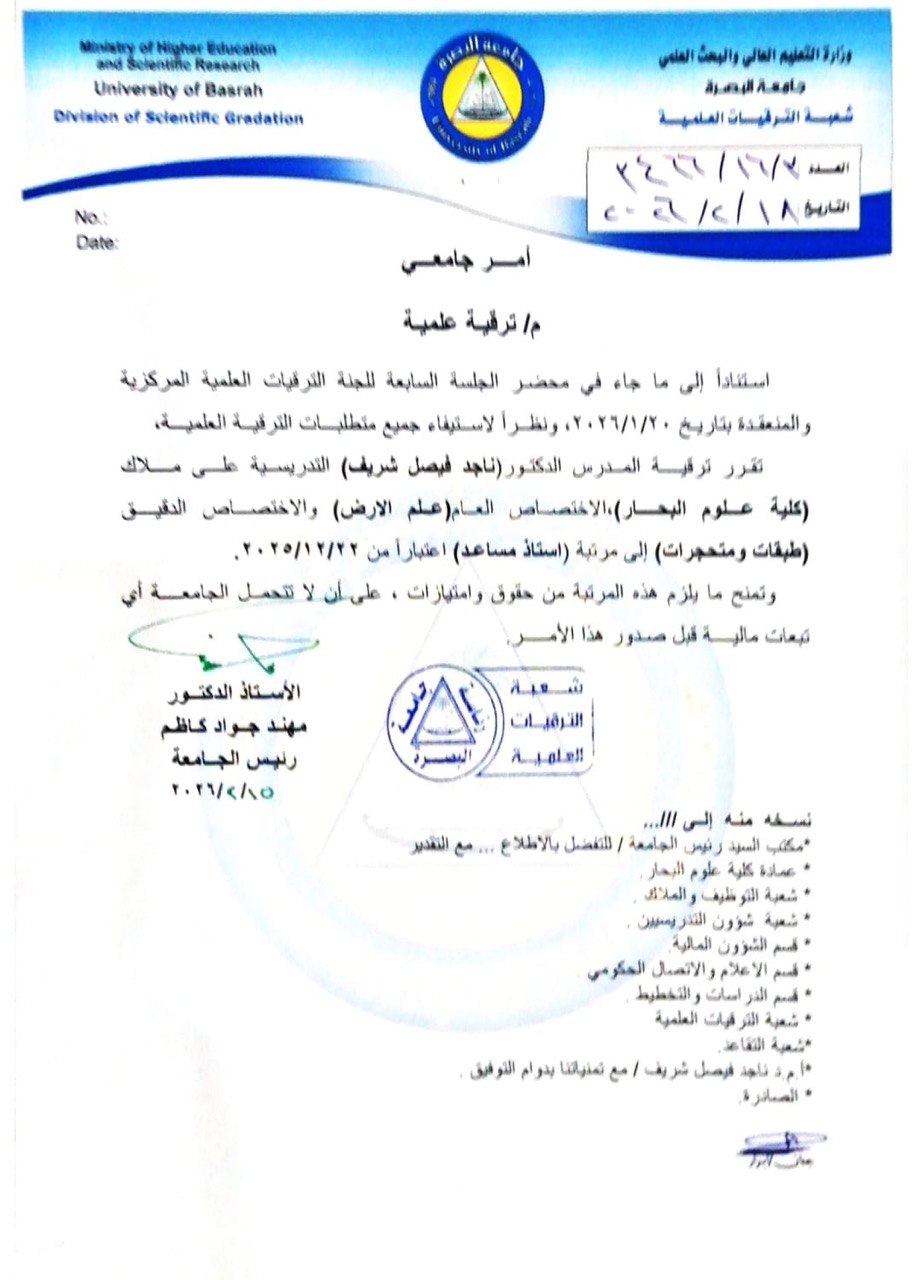 Dr. Najid Faisal Sharif, a faculty member at the College of Marine Sciences, University of Basrah, has been promoted to the rank of Assistant Professor after fulfilling the requirements stipulated in the Scientific Promotions Law. This promotion was granted by University Decision No. (3/16/3466) issued by the University of Basrah on February 18, 2026.